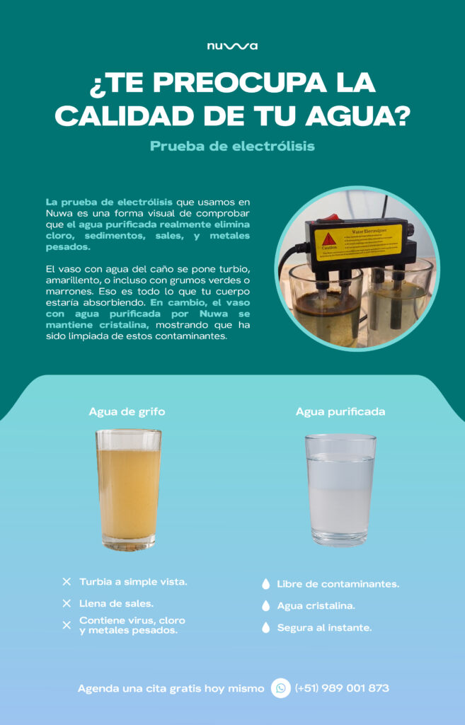 Con esta prueba puedes comprobar de primera mano que nuestros sistemas de Ultrafiltración y Ósmosis Inversa remueven contaminantes como patógenos, cloro, sedimentos y metales pesados. Si quieres verificar la alta eficiencia de nuestra tecnología, escríbenos al +51 934 814 386 y agenda una asesoría gratuita, o visita nuestro showroom, donde te demostraremos que el agua purificada de Nuwa es la mejor inversión para tu salud.